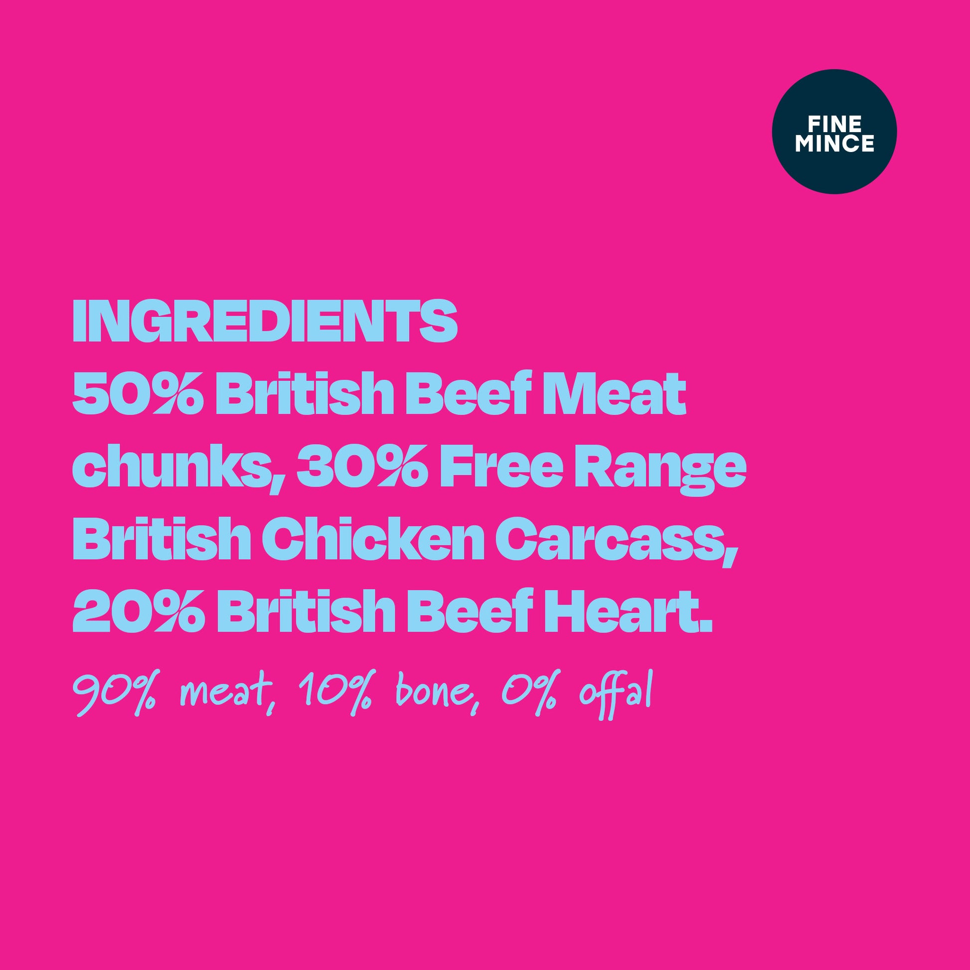 50% British Beef Meat chunks, 30% Free Range British Chicken Carcass, 20% British Beef Heart