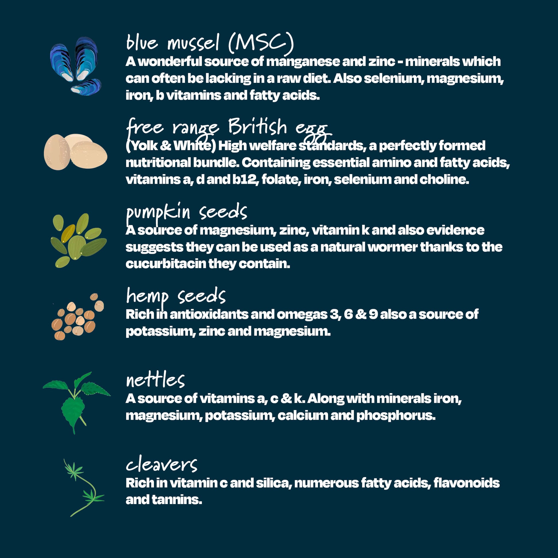 MSC Sustainably sourced from Scandinavia, far fewer food miles than green lipped mussel and the same wonderful source of manganese and zinc - minerals which can often be lacking in a raw diet. Also selenium, magnesium, iron, b vitamins and fatty acids.